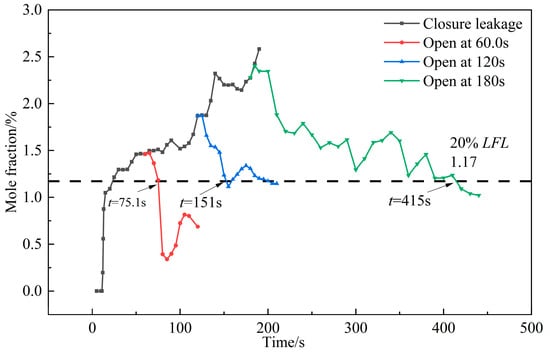 Figure 27 presents a simulation of H-BNG (20% hydrogen, LFL = 5.86%) leaking in a restaurant without an exhaust fan, followed by manual intervention to stop the leak and open the front door for natural diffusion. The results show that the duration of the leak significantly affects the efficiency of combustible gas dilution: as the leak duration extends from 60 s to 120 s and 180 s, the time required for the concentration to drop below the LFL 20% threshold (alarm cutoff time) increases to 75.1 s, 151 s, and 415 s, respectively, with a significant increase (101% and 175%, respectively).
