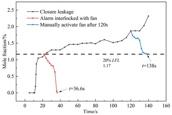 This section explores the diffusion characteristics of 20% H-BNG in a sealed restaurant (front door closed) under a SUCTION leak mode, with a leak rate of 2.322 kg/s, a pressure of 500 Pa, and dimensions of 700 × 500 mm, with a “uniform” profile and a leak location at (0, 4, 2.4). The focus is on analyzing the effect of closing the valve and starting the fan at different times on gas mole fraction.