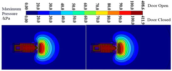 Figure 29 shows the evolution of maximum pressure during the explosion of H-BNG under different door states. The front door’s venting pressure setting has limited impact on the explosion’s consequences, especially when the ventilation area ratio is around 0.05, where the venting pressure has minimal effect on the peak explosion pressure. Whether the door is open or closed, the maximum explosion pressure in the restaurant increases slightly from 409 kPa to 412 kPa, with the injury radius (20.5 m causing injury, 12.5 m causing death) remaining largely unaffected by the door state.