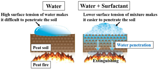 Various measures have been implemented to manage peat fires, including the development of early fire detection systems [9], the creation of firebreaks [10] by digging trenches in the soil, and direct firefighting efforts. Water is the most commonly used firefighting agent and is applied both aerially [11] and on the ground. In ground-based firefighting, water is either sprayed onto the soil surface or directly injected into the affected area [12]. The addition of firefighting agents, such as surfactants, to the water used for firefighting has also been explored [13,14]. Surfactants reduce the surface tension [15], enhancing the water’s ability to penetrate combustible materials. For combustion to continue, fuel, oxygen, and heat must be present. If any of these elements are removed, combustion will cease. Water is an effective fire suppressant because it absorbs large amounts of heat as it vaporizes. However, its high surface tension prevents it from penetrating the heat source. The application of aqueous solutions of firefighting agents can help penetrate combusting materials, helping absorb heat and lower the temperature below the combustion threshold. Firefighting agents that enhance surface wetting and penetration may be particularly effective for peat fires because peat soils have hydrophobic surfaces (Figure 1). However, the widespread use of synthetic surfactants raises concerns about their environmental toxicity.