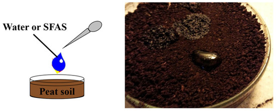 A soil permeability test was conducted using the water drop penetration time method [28]. For this method, approximately 60 g of peat soil was collected in a glass Petri dish, and approximately 200 µL water or SFAS diluted to 1 vol.% with groundwater was dripped onto the surface using a syringe (Figure 2). The time required for the droplets to completely penetrate into the peat soil was recorded.