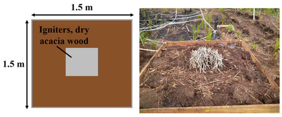 Firefighting experiments based on the mesoscale experiments described by Kanyama et al. [22] were conducted on 15–23 September 2023, using 1.5 m × 1.5 m × 0.3 m peat boxes. At each of the JR and KL sites, two plots were prepared for firefighting experiments with water (W1, W2) and another two for firefighting experiments with SFAS (SFAS1, SFAS2). A paraffin igniter and wood were used to burn the peat. Although the ignition method differed from that described by Kanyama et al. [22], the duration of peat combustion for 24 h was confirmed in a small-scale experiment. Specifically, six paraffin igniters and 1.6 kg of dry acacia wood were placed in the center of each peat box. The igniters were heated using a gas burner for 1 min to ignite the wood (Figure 3). The fire was allowed to burn for 24 h. Although the soft fiberboard used by Kanyama et al. was unavailable, the peat soil combustion was nevertheless maintained for 24 h, validating the experiment. The temperature distribution on the peat soil surface was captured using a thermal imaging camera (E6xt, FLIR Systems Inc., Wilsonville, OR, USA; measuring range: −20 °C to 550 °C; accuracy: ±2 °C).