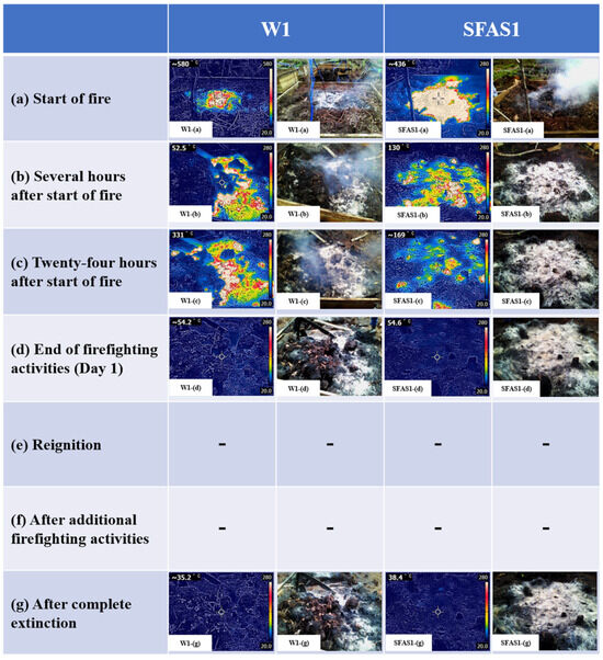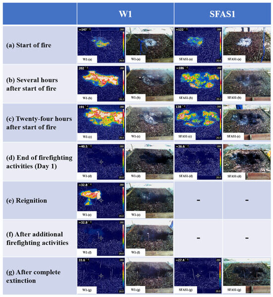 At 24 h after the fire began (Figure 4 and Figure 5c), firefighting activities were initiated, and surface temperatures temporarily dropped below 50 °C in all plots during firefighting activities. Two plots at the JR site (W1, SFAS2) and four plots at the KL site were sprayed again when the surface temperatures exceeded 50 °C over time. At the KL site, two water-treated plots (W1, W2) initially had surface temperatures below 50 °C, as shown in Figure 5W1-(d); however, reignition occurred within 24 h of the initial firefighting activities, and hot spots appeared (Figure 5W1-(e)); thus, additional firefighting was conducted (Figure 5W1-(f)). In contrast, no reignition occurred in the SFSA-treated plots at this site, requiring no further firefighting. Furthermore, no reignition occurred within 24 h of the initial firefighting activities for the four plots at the JR site.