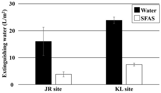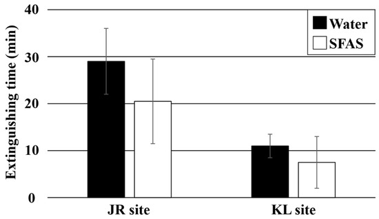 Figure 7 shows the time needed to extinguish the fire. Overall, 29 and 11 min were required for the water-treated and SFAS-treated plots at the JR site, respectively, while 21 and 8 min were required for those at the KL site, respectively. More water was needed for the water-treated plots because of the high surface tension of water, which hindered penetration into the peat soil. Conversely, less water was used for the SFAS-treated plots, enabling the fire to be extinguished faster. The use of SFAS reduced the firefighting time, allowing firefighting to be completed more rapidly and efficiently. The use of firefighting agents has been reported to reduce the time required to extinguish fires [13,19,23], but it has been suggested that the composition of the firefighting agents as well as the kind of peat soil may have an effect on the rate of reduction.