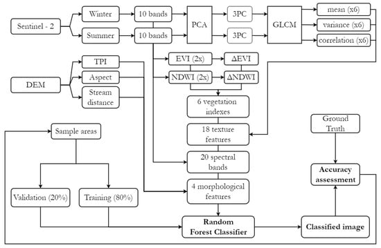 Appendix A) varied primarily between timeframes but also between metrics, probably due to spectral shifts caused by fire. Of the vegetation indices, summer NDWI consistently ranked among the three most influential variables. Regarding the 10 satellite bands, B8 and/or B8A (summer), B3 (winter), and B4 (summer) exerted the greatest influence across both models. In the case of GLCM indices, statistical measures derived from the third principal component (PC) held the highest relevance, particularly the variance index (summer/winter) [