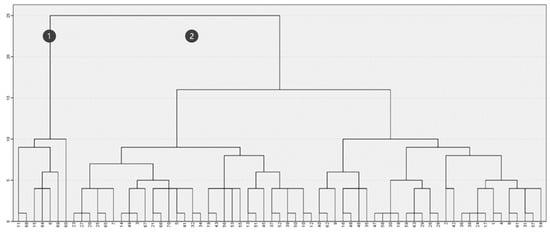 Figure 4), the analysis distinctly identified two main groups: one corresponding to plots with large trees exceeding 12 m (