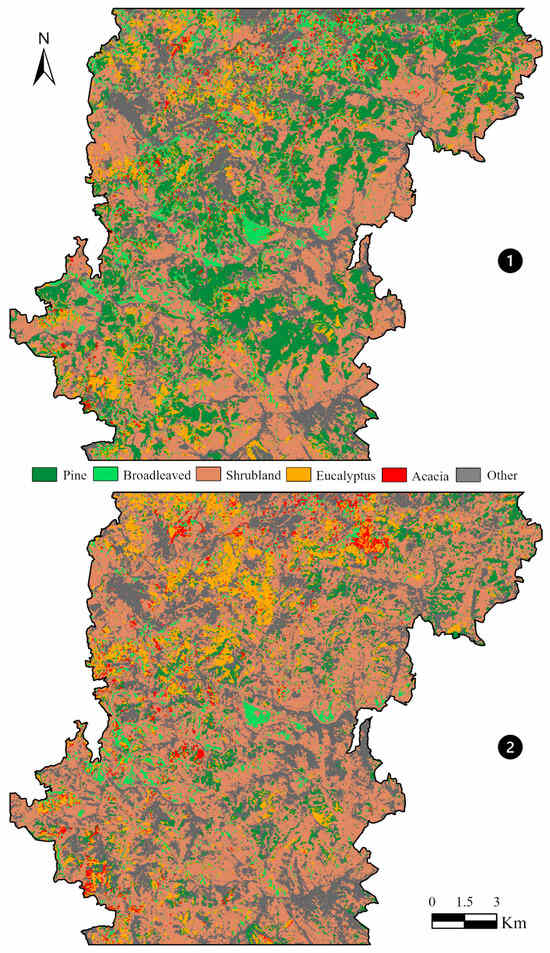 The occurrence of fire reset most vegetation communities to an early successional stage, reducing intraclass heterogeneity while increasing interclass homogeneity. This shift made spectrally distinguishing between certain land covers more challenging, particularly pure shrublands and shrublands with tree species recovery (e.g., Pinus pinaster). Furthermore, the relatively low spatial resolution of the imagery (10–20 m) hindered the detection of areas where tree saplings were present but not yet dominant, a common feature of native vegetation recovery, as frequently observed in field plots. Additionally, mixed pixels near class boundaries introduced classification uncertainties, especially for species whose lateral expansion patterns could be misinterpreted due to parameter variations in the classification process.