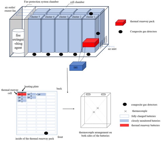 Composite gas detectors were placed at the bottom, middle, and top of the thermal runaway cluster, as well as at the bottom of the first, second, third, and fourth clusters to the left of the thermal runaway cluster. One detector was also placed inside the thermal runaway pack. Consistent with actual engineering design standards, only the detector at the top of the thermal runaway cluster was connected to the fire control panel, while all other detectors functioned exclusively for CO and VOC concentration monitoring. The heating plate was placed behind cell #1. Eleven K-type thermocouples were arranged on the surfaces of cells #1–#5 and near cell #6 to monitor temperatures. The battery management system (BMS) was placed outside the cabin to prevent damage. Cameras were positioned near the vent openings of the thermal runaway pack and at the top of the cluster to observe the overall situation inside and outside the cabin.