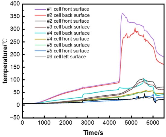 Figure 3 shows the temperature curves of the runaway cell and surrounding cells. Due to heat conduction, the rear temperature of cell #2 followed a similar trend to the front temperature of the runaway cell, but its peak temperature was 58 °C lower. The front surface of cell #2 reached a maximum temperature of 105 °C, while cells #3, #4, and #5 showed lower peak temperatures. Throughout the experiment, the voltages of the surrounding cells showed no significant changes.