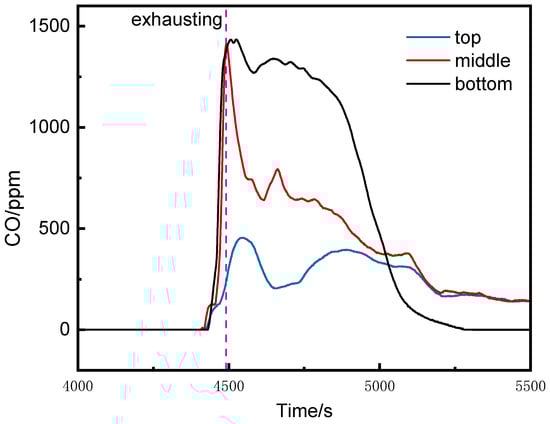 Figure 5 shows the CO concentration curves at the bottom, middle, and top of the runaway cluster. After thermal runaway, the CO concentrations at the bottom and middle rose rapidly, reaching alarm thresholds at 4452 s and 4464 s, respectively. The top detector triggered the alarm at 4491 s, activating ventilation. The peak CO concentrations at the middle and bottom were 1413 ppm and 1434 ppm, respectively, while the top peaked at 454 ppm. The bottom and middle detectors reached the alarm threshold 25 s and 39 s earlier than the top, respectively, and their peak concentrations were over three times higher.