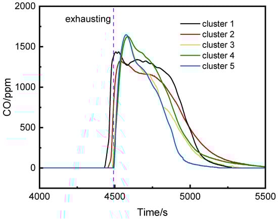 Figure 6 shows the CO concentration curves at the bottoms of the runaway cluster and adjacent clusters. After thermal runaway, CO was detected first at the bottom of the runaway cluster and the second cluster, rising rapidly to peak concentrations. Ventilation caused CO concentrations on the left side of the runaway cluster to exceed those in the runaway cluster, potentially affecting fire system judgments.