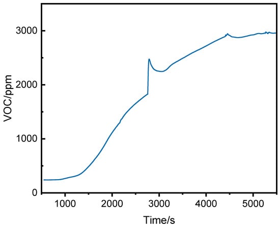 Figure 7 shows the VOC concentration curve inside the pack. The initial VOC concentration was stable at 238 ppm. As the heating plate temperature rose, organic compounds decomposed or volatilized, causing the VOC concentration to rise steadily. At 2780 s, small-scale combustion led to a rapid increase. During thermal runaway, the VOC concentration peaked at 2944 ppm at 4459 s.