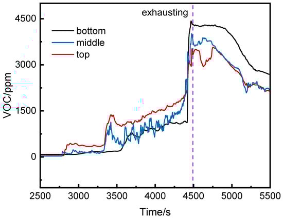 Figure 8 shows the VOC concentration curves at the top, middle, and bottom of the runaway cluster. Before thermal runaway, the middle and top VOC concentrations were generally higher than at the bottom. After thermal runaway, the bottom VOC concentration exceeded other positions, peaking at 4425 ppm at 4468 s.