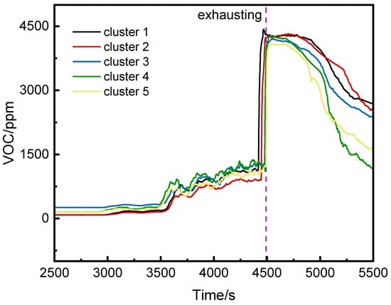 Figure 9 shows the VOC concentration curves for the runaway cluster and adjacent clusters. The trends were similar, with fluctuations starting around 3000 s. Before thermal runaway, airflow caused the bottom VOC concentration of the runaway cluster to not be the highest. After thermal runaway, it rose rapidly and surpassed the other clusters.
