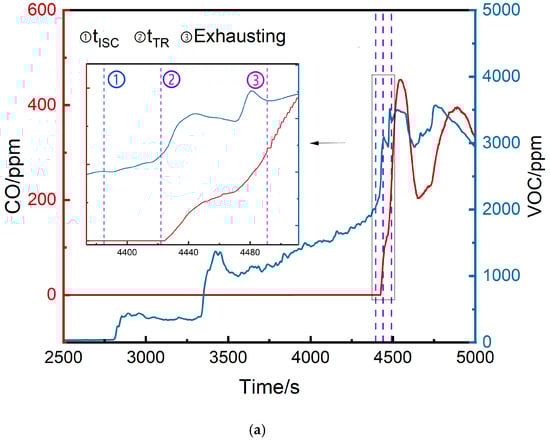 Comparison of CO and VOC of the thermal runaway cluster. (a) Comparison of CO and VOC at the top of the thermal runaway cluster. (b) Comparison of CO and VOC at the middle of the thermal runaway cluster. (c) Comparison of CO and VOC at the bottom of the thermal runaway cluster.