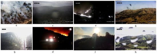 Examples from the D-Fire dataset: (a) top–down view, (b) high-brightness non-fire target, (c) foggy weather, (d) nighttime fire and car headlights, (e) nighttime fire, (f) bright morning sun, (g) lens insect, and (h) lens water droplets.