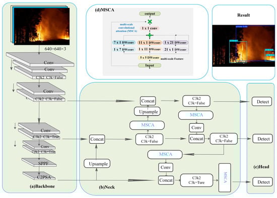 YOLO11s-MSCA framework ((a) YOLO11 backbone; (b) YOLO11 neck; (c) YOLO11 head; and (d) MSCA module).