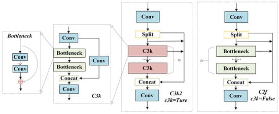 The latest YOLO network framework consists of four main components: the input, backbone, neck, and head, as illustrated in parts a, b, and c of Figure 3. The input layer processes the image and applies data augmentation []. The backbone network is responsible for extracting multi-scale features from the input image. The neck uses a Feature Pyramid Network (FPN) [] to aggregate features from different scales, enhancing the model’s ability to detect objects of various sizes and improving multi-scale semantic representation. The detection head consists of several convolutional layers designed to produce detection results.