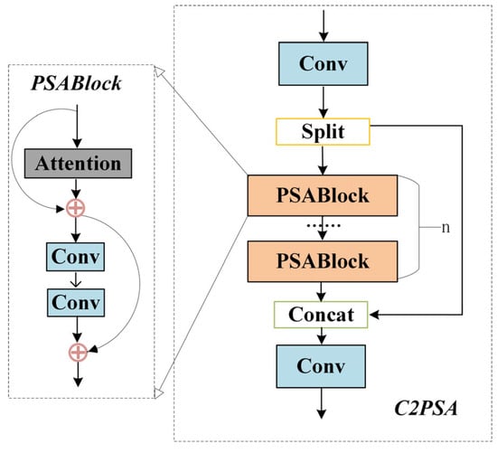 This paper focuses on YOLO11, a model developed by the Ultralytics team, similar to YOLOv8, with several improvements based on YOLOv8 []. Key information can be found on the website https://docs.ultralytics.com/models/yolo11/ (accessed on 15 April 2025). The backbone modules of YOLO11 include the Conv composite module (comprising Conv2d, batch normalization [], and the SiLU activation function []), the C3k2 module, the Spatial Pyramid Fast Pooling (SPPF) module [], and the Cross Stage Partial Spatial Attention (C2PSA) module. C3k2 and C2PSA are novel modules introduced by YOLO11. The C3k2 module enhances the model’s adaptability to complex scenes by employing parallel convolution and optimized parameter settings, effectively handling multi-scale features. The module achieves efficient feature extraction through parallel convolution branch and parameter configurable design. Its core adopts a two-way structure: one way directly transfers shallow features, and the other way processes deep features through an optional C3k (variable convolution kernel) or standard bottleneck module and finally concatenates and fuses. When C3k is false, C3k2 is C2f, and when C3k is true, the module is C3k2. The details are shown in Figure 4. Meanwhile, the C2PSA module combines the Cross Stage Partial (CSP) [] structure and the Pyramid Squeeze Attention (PSA) [] mechanism, further boosting feature extraction capabilities, particularly excelling in multi-scale feature extraction. CSP will process the feature map by dividing it into two parts: one part is directly transmitted, while the other part is processed through the PSA module. Finally, the two parts are concatenated and fused. By emphasizing spatial correlations in feature maps, C2PSA ensures that the model focuses on crucial regions, thereby striking a balance between computational cost and detection accuracy (refer to Figure 5 for details). In the detection head, YOLO11 produces detection results at three different scales by utilizing feature maps generated from the backbone and neck.