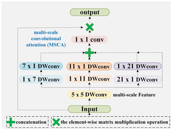 Here, In represents the input features, MSCA and Out denote the attention map and output, respectively, ⊗ signifies the element-wise matrix multiplication operation, DW_Conv stands for depth-wise convolution, Scalei represents the i-th scale branch, and Scale0 is the identity connection. A detailed diagram of the MSCA module is shown in Figure 6.