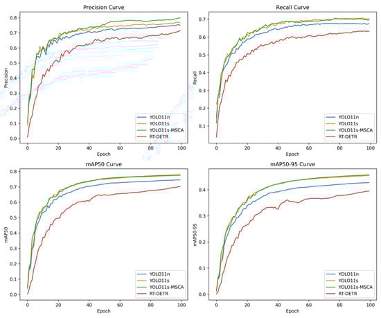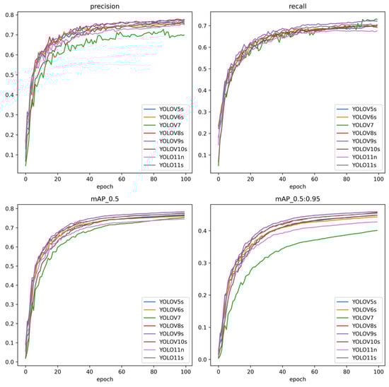 The variation in evaluation metrics during model training is shown in Figure 7. It can be observed that YOLOv7 performs the worst in terms of precision, while the differences among the other models are not significant. For recall, YOLO11n performs the worst, and YOLOv7 achieves the highest score. YOLOv9s and YOLO11s exhibit the most stable changes, indicating that these two models have a high precision rate and can stably and continuously observe targets. YOLO11n and YOLOv7 show the worst mAP results, while YOLOv9s performs the best. The performance of YOLO11s and several other models under different IoU thresholds varies little. Although YOLO11s does not achieve the best results in all metrics, each metric remains stable and ranks highly, demonstrating its advantage of stability and balance.