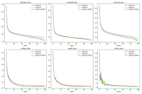 In the process of YOLO series model training and verification, the optimal model is determined by minimizing the bounding box loss (box_loss), confidence loss (dfl_loss), and classification loss (cls_loss). As seen in Figure 8, YOLO11n, YOLO11s, and YOLO11s-MSCA losses are gradually minimized during the training process, and the YOLO11s-MSCA model has the best minimization effect, the model converges faster, and YOLO11n is the worst; in the validation set, there is no significant difference in the localization loss of the boundaries of YOLO11s and YOLO11s-MSCA. YOLO11n has the worst localization ability, the three models have little difference in confidence loss, and YOLO11s-MSCA accelerates the fastest convergence in classification loss, suggesting that the introduced attentional mechanism can focus on our region of interest faster.