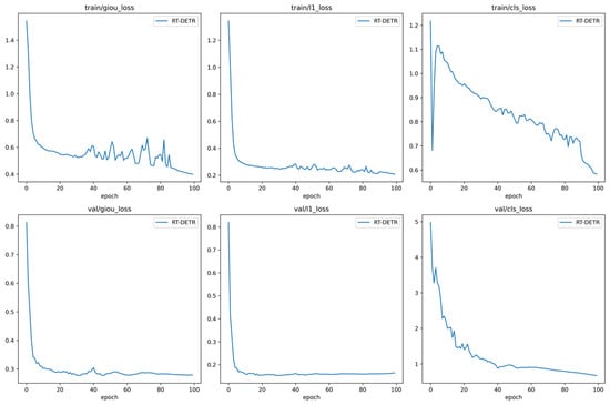 Due to different models, RT-DETR loss function combines classification loss, L1loss and IOUloss to optimize the boundary box regression effect. The decrease in Giou_loss indicates that the boundary frame positioning changes, and the decrease in L1_loss indicates that the coordinate prediction is more stable. Figure 9 shows that during model training, boundary positioning gradually tends to be stable, and classification loss, although it has a downward trend, has been fluctuating violently. In the validation process, the positioning ability of the RT-DETR model tends to stabilize faster than that of YOLO series models, but the classification loss (cls_loss) tends to stabilize more slowly than that of YOLO series models.