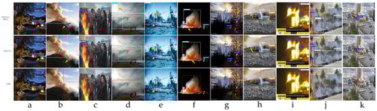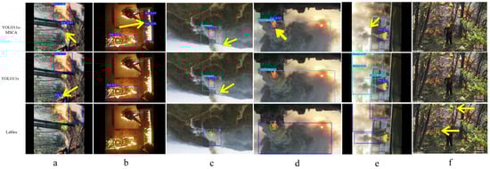 - Enhanced Confidence and Localization Accuracy: The YOLO11s-MSCA model demonstrates superior confidence scores and more precise localization capabilities. As shown in Figure 14a–c (highlighted with yellow arrows), the model accurately detects fire and smoke targets. Notably, in Figure 14b, it correctly identifies a fire instance that is absent in the ground truth annotations, and in Figure 14c, it effectively localizes a broader region of smoke. These results confirm the efficacy of the introduced attention mechanism in improving target recognition.