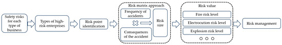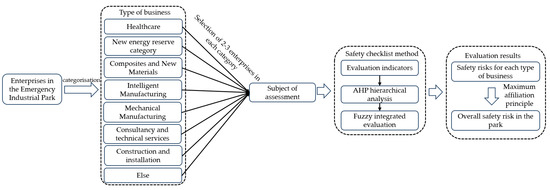 (3) The weight-coupled fuzzy comprehensive evaluation is used to derive the comprehensive evaluation results, and we the principle of maximum affiliation for processing, seeking to derive the level of safety risk of each enterprise. Finally, again, we use the principle of the maximum membership degree to obtain the overall safety risk of the park. The risk assessment flowchart is shown in Figure 2.