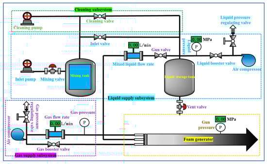 The foam generation system used in this experiment is a CAFS, which generates foam with different expansion ratios by adjusting the air-to-liquid ratio. The system mainly consists of the air supply subsystem, the liquid supply subsystem, the foam generator, and the cleaning subsystem, with the structural diagram shown in Figure 1. The air supply subsystem and the liquid supply subsystem provide compressed air and foam solutions to the foam generator, respectively. The foam generator thoroughly mixes the air and foam solutions to produce foam. The cleaning subsystem is used for cleaning the equipment after use. The specific steps for foam generation are as follows: