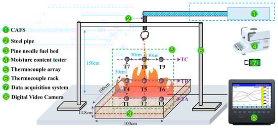 The moisture content tester is used to measure the moisture content of the pine needles, and the moisture content is controlled to remain consistent through drying, in order to eliminate the influence of moisture on the experimental results. Nine K-type thermocouples, each 1.5 m in length, are suspended and fixed on a thermocouple rack to monitor temperature changes during the fire suppression process. The K-type thermocouples used in this study had a probe diameter of 2 mm, a length of 50 cm, a measurement range of 0~1300 °C, and a response time of approximately 1 s in air. The measurement data are transmitted to the data logger via data cables. The sampling frequency of the data logger was 10 Hz. These thermocouples are divided into three groups (TA, TB, and TC), with each group consisting of three thermocouples, positioned at the same horizontal level. The TA group (T1, T2, T3) is located inside the fuel bed, and the average temperature reading from these thermocouples is used to represent the temperature changes inside the fuel bed. The TB group (T4, T5, T6) is placed 50 cm above the fuel bed, with the average value reflecting the temperature changes at this height. The TC group (T7, T8, T9) is positioned 100 cm above the fuel bed, and its average value is used to characterize the temperature changes at this height. Additionally, a DV camera mounted on the side of the experimental setup is used to record the dynamic changes in the flame shape under the influence of CAF during the fire suppression process.