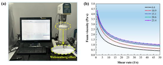 As shown in Figure 3a, during the foam viscosity measurement, the foam was observed to climb along the rotor (Weissenberg effect), which is a characteristic of non-Newtonian fluids [37]. Figure 3b demonstrates that under different foam expansion ratios, the foam viscosity decreases with increasing shear rate, indicating that the foam exhibits shear-thinning behavior. These two phenomena confirm the rheological properties of the foam. Accordingly, the relationship between foam viscosity and shear rate was fitted using the power–law rheological model, as described in Equation (1) [38]. Table 3 presents the fitting parameters under various expansion ratio conditions.