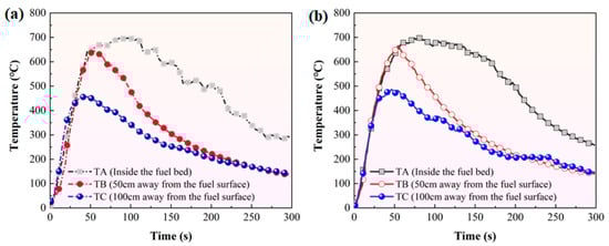 Temperature variation trends during two free burning experiments: (a) first free burning experiment; (b) second free burning experiment.