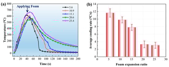 Temperature curves and average cooling rates inside the fuel bed under different foam expansion ratios: (a) average temperature variation curves of the fuel bed under different foam expansion ratios; (b) average cooling rates of the fuel bed under different foam expansion ratios (including repeated experiments).