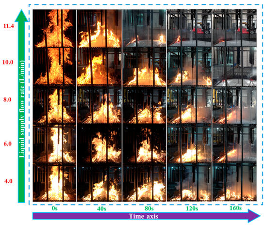 As shown in Figure 10, when the supply flow rate is 4 L/min, the foam coverage extinguishing time is 271 s. As the supply flow rate increases to 10 L/min, the extinguishing time quickly decreases to 103 s. This is because a higher supply flow rate allows for faster coverage of the fire source, significantly reducing the time required for fire suppression. However, when the supply flow rate exceeds 10 L/min, the rate of reduction in extinguishing time slows down and becomes less significant. The core mechanism of foam fire suppression lies in isolating the fuel from oxygen through coverage and reducing the fuel temperature through cooling [39]. Once the cooling and isolation effects of the foam are sufficient to extinguish the flames, additional supply flow rates contribute minimally to enhancing these effects. Furthermore, both processes require a certain amount of time to complete, and increasing the supply flow rate further does not significantly accelerate these physical and chemical processes. Therefore, the fire suppression efficiency tends to stabilize.