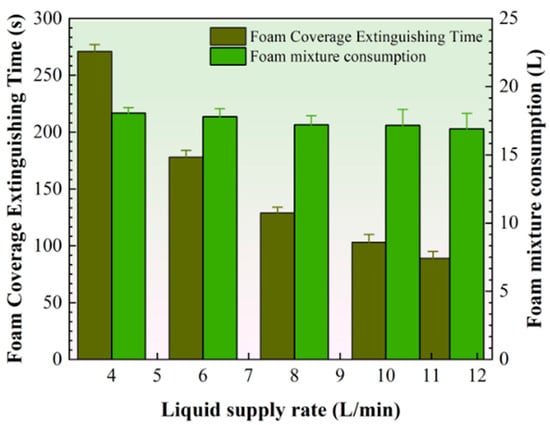 Foam coverage suppression time and the amount of foam mixture required for fire suppression under different liquid flow rates (average value of repeated experiments).