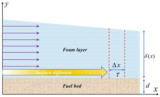 The spreading of foam on the surface of the fuel bed is primarily driven by the hydrostatic pressure gradient caused by its own gravity and surface tension, as shown in Figure 11. The hydrostatic pressure gradient acts on regions of different thickness within the foam layer, driving the foam to flow from thicker areas to thinner ones. Surface tension, on the other hand, acts at the leading edge of the foam layer, generating an extending force. Generally, when the foam layer is relatively thick, the effect of surface tension can be neglected [40]. This is because, in a thicker foam layer, the driving force from the hydrostatic pressure gradient is significantly greater than that from surface tension [40,41]. Therefore, the total driving force for foam spreading can be expressed as: