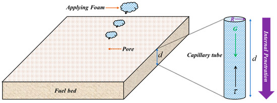 The above analysis determines the surface spreading velocity of foam on the fuel bed. However, due to the porous medium characteristics of the fuel bed, the foam may also continuously penetrate into its interior. Here, the fuel bed is regarded as a bundle of capillaries, with its internal pore channels simplified as capillaries of uniform radius, as shown in Figure 12. When foam is applied to the fuel bed, some of it flows downward through these capillaries from the upper surface to the bottom of the fuel bed. In this process, the pressure induced by the foam’s own weight serves as the primary driving force for penetration. The driving force acting on the foam within the cross-section of a capillary can be expressed as: