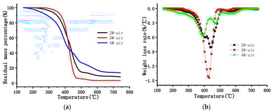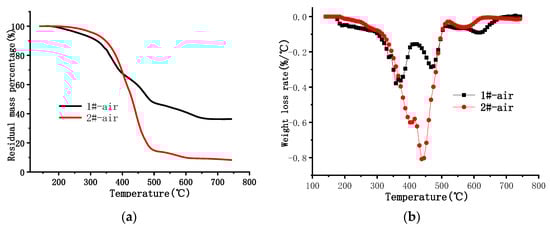 Table 2 depicts that the first two weight loss stages of Sample 2# under an air atmosphere and a nitrogen atmosphere are higher than that of Sample 1#, indicating that the reaction of Sample 2# is stronger during the pyrolysis process. The max weight loss peak of Sample 2# appearing in the second weight-loss stage is 16.17%/min, nearly twice that of Sample 1#, and the temperature appears 65 °C higher than that of Sample 1#. In the air, the conclusion can be drawn that the weight-loss process of the two samples is the same at every temperature segment of pyrolysis. In the nitrogen, there is a continuous weight-loss peak; thus, it cannot be compared in sections. The weight-loss temperature stages of the two samples are similar, but there is an obvious difference in the weight-loss percentage of each stage.