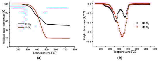 In a nitrogen atmosphere, the weightlessness phase of Sample 1# can be categorized into two distinct stages, and the weightlessness process is consistent with the first two stages in an air atmosphere, which are the volatilization of light components, pyrolysis of heavy components, and the volatilization of macromolecular compounds. However, the first stage of the corresponding time lags relatively under the air atmosphere, which implies that the oxygen reaction has a certain promoting role in this stage. Then, the pyrolysis rate is the same as that in the atmosphere of air, which is due to the higher oxygen content of the pyrolysis at this phase []. With the increase in temperature, residue slowly decomposes under a nitrogen atmosphere. Weight loss of peak corresponding to what is in air atmosphere does not appear. Eventually, the residue is black coke, and the percentage of remaining mass is higher than in the air atmosphere. For Sample 2#, in a nitrogen atmosphere, the weightlessness process is one stage in which the small shoulder peak under the air atmosphere and oxidation peak in high-temperature conditions disappear. The entire process of weightlessness is continuous.
