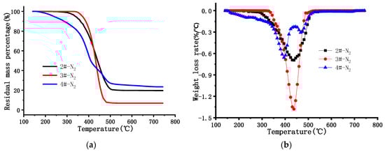 During the pyrolysis in the nitrogen atmosphere, compared to the combustion process, the number of weight-loss phases of Sample 2# becomes 1, but the tendency of the two other samples does not have an obvious change. The three samples show an increase in the initial decomposition temperature; however, the decomposition temperature after the main stage decreases. Notably, the maximum value and temperature of the weight loss peak remain unchanged.
