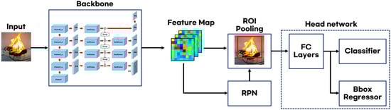 23], the Faster R-CNN architecture operates in a series of sequential stages. In the initial stage, the backbone network employs a CNN-based residual network (ResNet) algorithm to extract diverse features from the input image, resulting in the generation of a feature map. Subsequently, the region proposal network (RPN) employs the aforementioned feature map to identify potential object areas within each box by utilizing anchor boxes of varied sizes and proportions. The third stage, ROI Pooling, processes each object region identified by the RPN to extract a fixed-size feature vector, which is then transmitted to the head stage. In the final stage, the head employs ROI Align to classify each object based on the extracted features and to ascertain its precise location. In this phase, the data are passed through fully connected layers (FC Layers), where the functions for class classification and bounding box prediction are established.