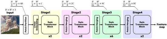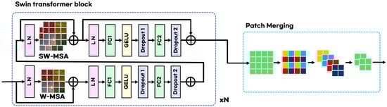 25]. The model divides the input image into discrete sections, each of which is treated as a unit of information that encapsulates features from the RGB channels. The image is partitioned into patches of size H × W × 3 through the patch partition method, which are subsequently subdivided into 4 × 4 × 3 sub-patches. Each sub-patch, with a size of 4 × 4 × 3 = 48, is subjected to linear embedding in order to facilitate its transition into the feature space. Subsequently, the swintransformer block employs an analysis of inter-patch relationships to extract the distinctive characteristics of the overall image. During the patch merging phase, adjacent patches are combined to derive features at a larger scale, thereby facilitating the consideration of a broader visual context. The merged patches generate a novel feature map of dimensions