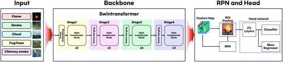 The present study offers a distinctive contribution by integrating the swintransformer as the backbone within the Faster R-CNN framework. This architectural enhancement introduces hierarchical attention and multiscale feature representation, which significantly improve the model’s capacity to detect small, dynamic, and visually ambiguous fire-related phenomena, such as fog, chimney smoke, and early-stage flames. These elements have traditionally challenged conventional CNN-based detectors. A notable distinction of this study is its utilization of ground-level visual data collected from controlled early-stage wildfire scenarios in mountainous forest regions of the Republic of Korea. This approach stands in contrast to previous studies that primarily relied on satellite or UAV imagery, often depicting fully developed wildfire events at a macroscopic scale. This unique dataset, characterized by low-visibility conditions and multi-class environments, serves as a more realistic benchmark for evaluating fire detection systems in their intended operational context. The integration of a vision transformer backbone with a region-based detection strategy has been demonstrated to enhance the model’s accuracy and robustness, particularly in scenarios involving diverse object scales and complex scenes. The empirical results presented in this study substantiate the proposed model’s superior performance, particularly under conditions that resemble the actual constraints of early wildfire detection and response in field deployments.