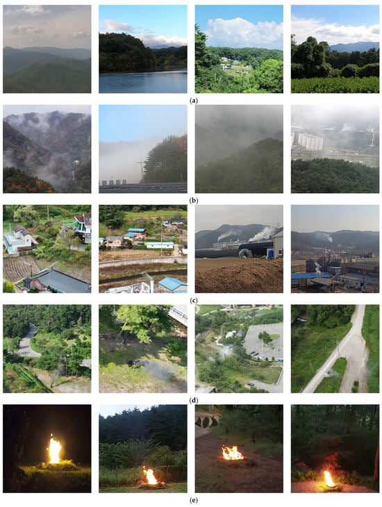 The fire-related classes encompassed images of flames and smoke in their nascent stages, as opposed to those of fully developed wildfires. This differentiation was intended to evaluate the model’s capability to detect early-stage wildfire scenarios, which have received less emphasis in prior studies. These non-fire classes encompassed a variety of images, such as clouds on sunny and cloudy days, fog/haze under different weather conditions, and chimney smoke from factories and residential areas. The collected images are displayed in