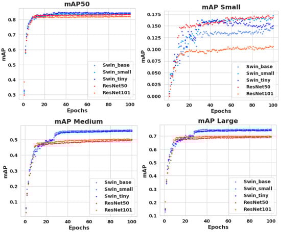 Figure 6, the training results of swintransformer-based models (swin_base, swin_small, and swin_tiny) and ResNet-based models (ResNet50 and ResNet101) are presented. The training was conducted over 100 epochs to ensure sufficient learning, and the performance of each model was analyzed in detail using the mAP50, mAP Small, mAP Medium, and mAP Large metrics.