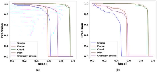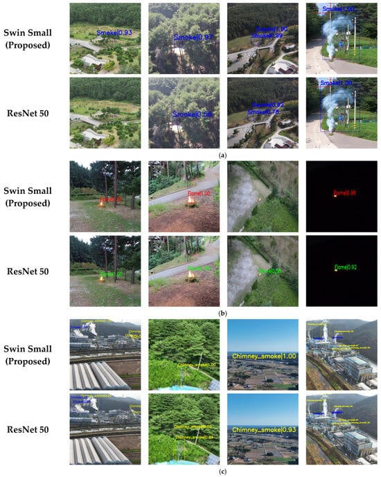 Figure 7 provides a visual comparison of the inference results of swintransformer-based and ResNet-based models for the smoke, flame, and chimney smoke classes. A comparative analysis of mAP Small from