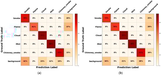In order to assess and contrast the performance of the model, metrics such as precision, recall, and mean average precision (mAP) were employed. In addition, confusion matrix analysis was conducted to visualize the model’s performance. True positive (TP), true negative (TN), false positive (FP), and false negative (FN) values were measured for the images to calculate precision and recall. These calculations were further used to derive average precision (AP) and mAP, which were employed to evaluate the detection performance of the five fire and non-fire classes. The calculation process is detailed in Equations (3)–(6) [