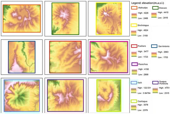- Military Geographic Institute of Ecuador (IGM). Cartographic Base of Ecuador: Contour Lines and Topographic Data. Scale 1:50,000. Quito, Ecuador. 2024. Available online: https://www.geoportaligm.gob.ec/portal/index.php/cartografia-de-libre-acceso-escala-50k/ (accessed on 30 July 2023).