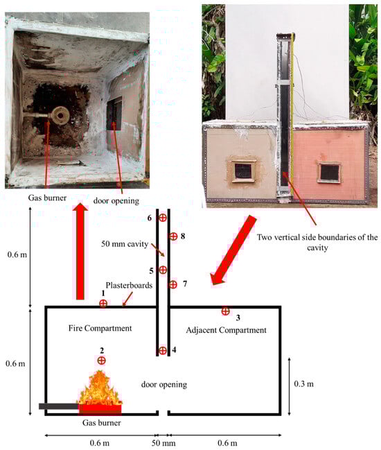 The experiment replicates a fire scenario in which a vertical intermodular cavity is exposed to fire due to the failure of cavity barriers, and fire stops around an opening between adjacent modular units. The most common module compartment dimensions used in the industry are 3 m × 3 m × 6 m [,]. This experiment used a 1:5 scale model of a modular unit (0.6 m × 0.6 m × 0.6 m), with its length halved to overcome safety and resources constraints. The cavity width between the two modules was maintained at 50 mm. The side boundaries of the cavity were left open to allow airflow, representing a case of improperly sealed cavity boundaries. The two compartments represented modular units with closed windows and a 0.2 m × 0.3 m door opening. The walls, floor, and ceiling of the modular unit were constructed from 10 mm thick plasterboard. The fire within the compartment in Figure 1 was set up using a circular gas burner, 125 mm in diameter, placed at the center of the fire compartment. This burner was fueled with a domestic-grade liquid petroleum gas mixture (propane:butane = 30:70). During the test, eight type-K thermocouples were used to monitor gas and surface temperature variations. The positioning of these thermocouples is shown in Figure 1, with additional details provided in Table 1.